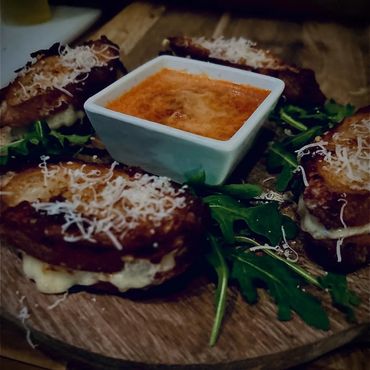 House -made garlic herb olive oil, mozzarella, prosciutto, fig jam, gorgonzola crumbles drizzled with hot honey topped with arugula